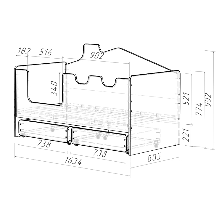 Безопасность ребенка во время сна и игр на кровати - это приоритет. Высокие безопасные борта высотой 521 мм обеспечивают надежную защиту от падений, а отсутствие острых углов и мягкий противоударный кант повышают безопасность использования. Стилизованный под домик задний борт создает атмосферу игры и фантазии, стимулируя развитие ребенка.