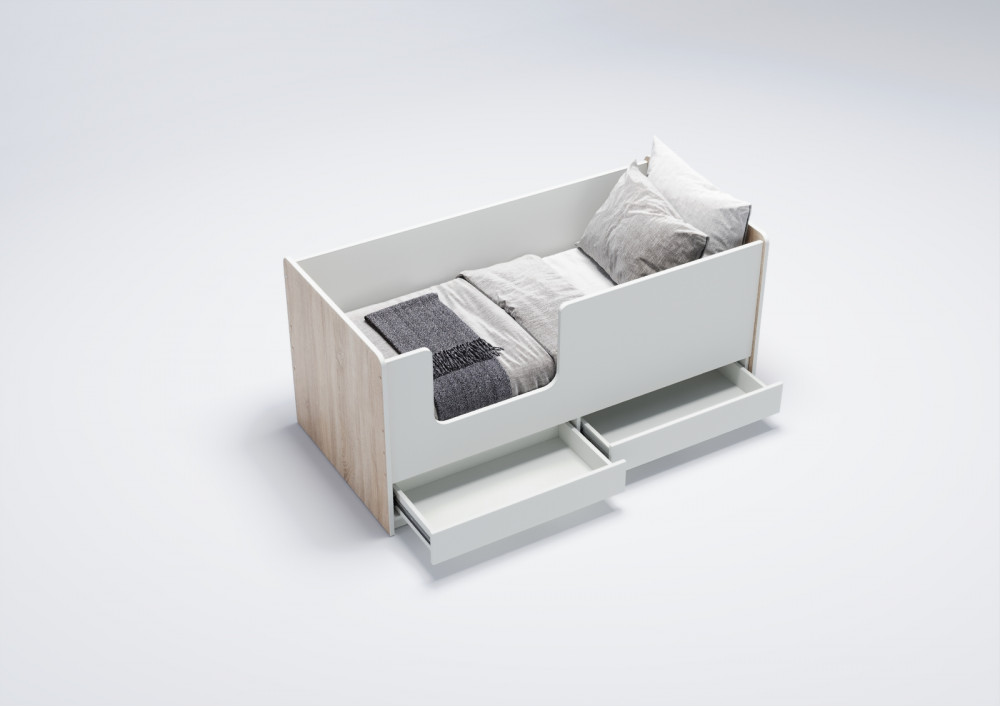 Уникальной особенностью модели "Легенда K202.04" являются два выдвижных вместительных ящика. Они оборудованы телескопическими направляющими с фиксаторами, что обеспечивает плавное выдвижение и фиксацию ящиков. Это позволяет эффективно использовать пространство под кроватью для хранения игрушек, одежды и других детских принадлежностей.